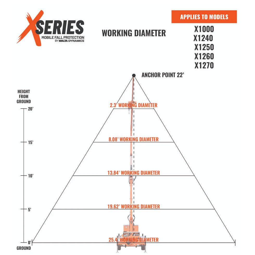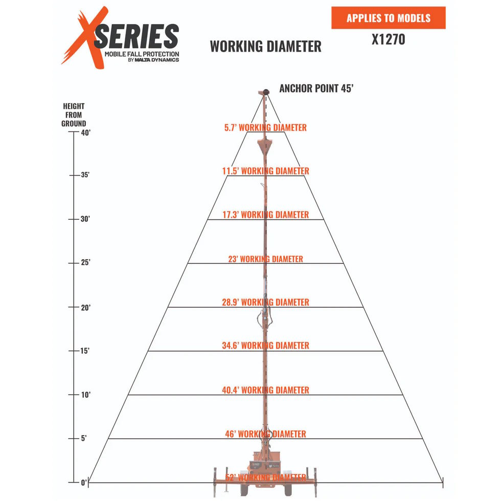 With an adjustable height mast extending up to 34 feet, the X1250 provides a high-reach anchor point for one worker. While the system features three total anchor points, only one can be used when the mast is fully extended to 34 feet, while the remaining two are intended for lower-height applications. Each anchor point supports a fall arrest capacity of 310 lbs., ensuring reliable, OSHA-compliant protection.