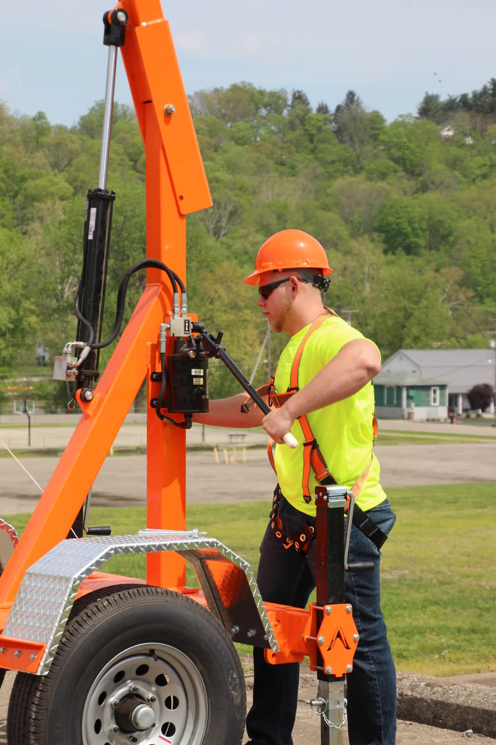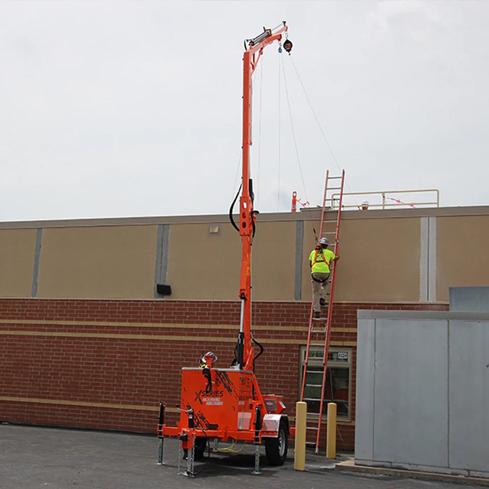 Manufactured in an ISO-9001 certified facility in the USA, the X1000E meets and exceeds strict OSHA fall protection standards. Its compact design allows for quick and efficient setup on roofs, work areas, or remote job sites, while the electric hydraulic system with remote control makes positioning and adjusting the system effortless. The X1000E’s adjustable outrigger jacks provide stability, allowing your team to set up tie-off points in a fraction of the time, without the need for additional lifting equipment.